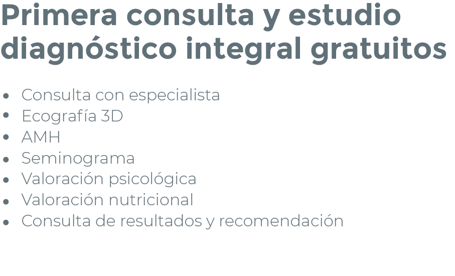 Presentamos nuestro nuevo pack de diagnóstico gratuito, diseñado para brindarte todas las respuestas y el apoyo que necesitas desde el inicio de tu viaje. Este pack exclusivo incluye una primera consulta personalizada, donde nuestros expertos en fertilidad comenzarán a conocer tu caso y guiarán los siguientes pasos a seguir.