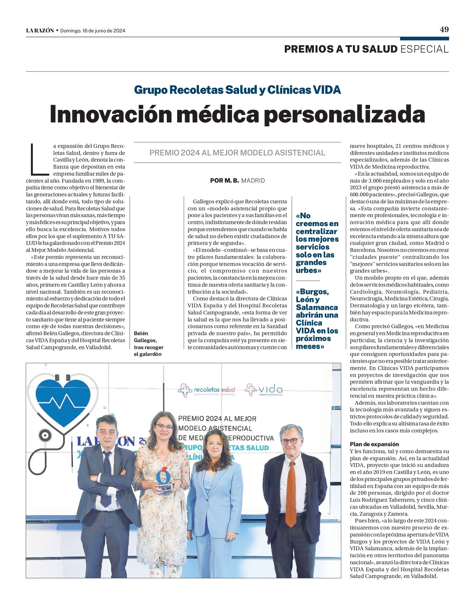 El suplemento A TU SALUD del periódico La Razón ha galardonado con el Premio 2024 al Mejor Modelo Asistencial al Grupo Recoletas Salud y a las Clínicas VIDA. «Este premio representa un reconocimiento a una empresa que lleva dedicándose a mejorar la vida de las personas a través de la salud desde hace más de 35 años, primero en Castilla y León y ahora a nivel nacional. Esta compañía invierte constantemente en profesionales, tecnología e innovación médica para que allí donde estemos el nivel de oferta sanitaria sea de excelencia estando a la misma altura que cualquier gran ciudad, como Madrid o Barcelona.”, afirma Belén Gallegos, directora de Clínicas Vida a nivel nacional.